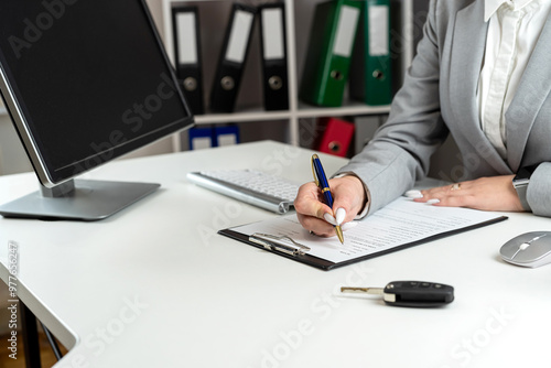 Happy woman signs a contract loan agreement, purchase new car or rent vechicle at office