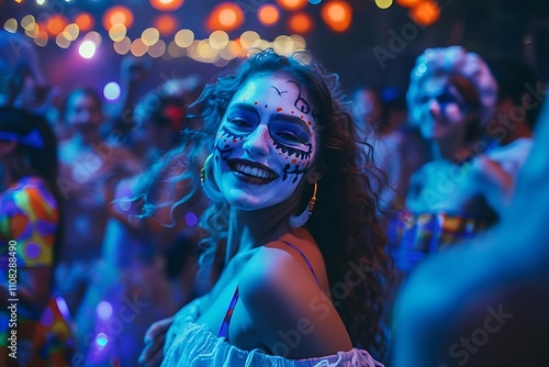 woman, party, costume, make-up, face paint, skull, halloween, celebration, festival, event, dance, fun, night, people, crowd, light, colourful, happy, smiling, girl, young, adult, fashion, beauty, attractive, festive, vibrant, energy, joy, expression, mask, art, design, holiday, october, tradition, culture, entertainment, music, friends, together, social, gathering, excitement
