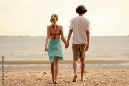 couple, beach, love, romantic, walking, sunset, hand, summer, vacation, together, woman, man, ocean, human relationships, happy, red, bikini, bonding, lifestyle, travel, holiday, tropical, freedom, young, casual attire, nature, barefoot beach, happiness, holding, moment, emotion, scenic, affectionate, sun, smiling, warm, resort, sand, gold, joy, people, connection, serene, peaceful, oneness, chill, mood