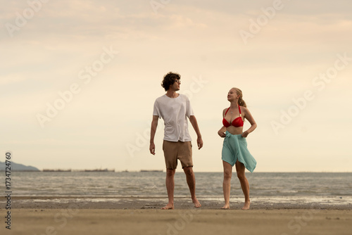 couple, beach, sunset, romantic, love, vacation, summer, happy, freedom, woman, man, ocean, sea, human relationships, moment, warm, joyful, standing, tropical, red, bikini, gold, light, bonding, relax, travel, nature, calm, lifestyle, emotion, young, mood, holiday, carefree, sun, people, connection, fun, silhouette, gesture, together, pose, fashion, sandy, date, movement