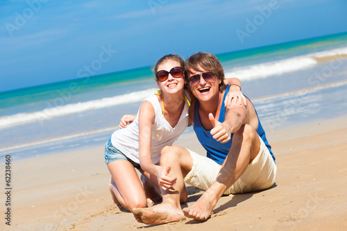 affair, beach, blue, bright, caucasian, closeness, coastline, couple, family, feeling, female, partiality, girl, hair, happiness, happy, gesture, holiday, love, man, smile, ocean, people, human relationships, romance, romantic, sea, shore, sky, smiling, space, summer, summer, sunlight, sunny, sunshine, together, 2, vacation, water, wave, woman, white, young, honeymoon, sunglasses, sand, coast, thumb up