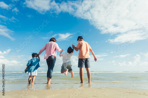 Happy young family Asian have fun on beach. Young family on vacation have a lot of fun