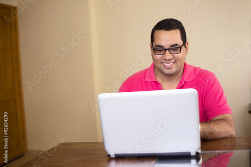 man, male, young, latino, computer, laptop, work, working, happy, smile, smiling, modern, technology, intelligent, goggles, home, leisure, lifestyle, using, cyberspace, casual attire, adult, wireless, sitting, person, online, guy, business, communication, browsing, house, cheerful, relax, table, attractive, office, living, relaxation, life, alone, relaxed, satisfied, enjoy, happiness, recreation, relaxing, enjoying, content, confidence, positivity