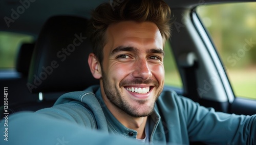 happy young rugged man smiling at the camera while seated in a car. close-up shot.