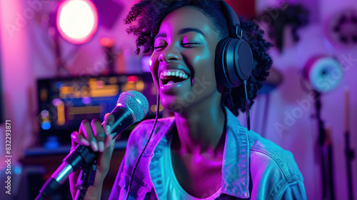 Happy young woman hosting an audio broadcast, animatedly speaking into the microphone in a studio bathed in neon purple light, capturing her enthusiasm and joy.