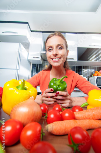 kitchen, vegetarian, vegetable, woman, healthy, fresh, food, cookery, cooker, cook, beautiful, casual attire, caucasian, chef, diet, dinner, female, freshness, girl, greener, happy, home, homemade, household, homemaker, indoor, ingredient, interior, lunch, making, meal, modern, 1, organic, people, pepper, person, prepare, raw, salad, sauce, smiling, soup, table, taste, tomatoes, wide, wife, young