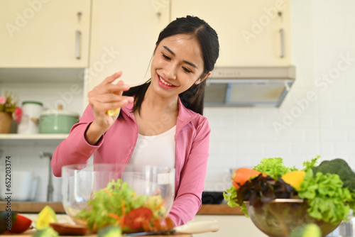 Happy young woman squeezing fresh lemon juice into bowl with vegetable salad. Healthy eating concept