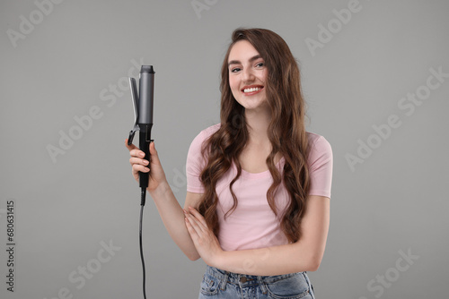 Happy young woman with beautiful hair holding curling iron on grey background