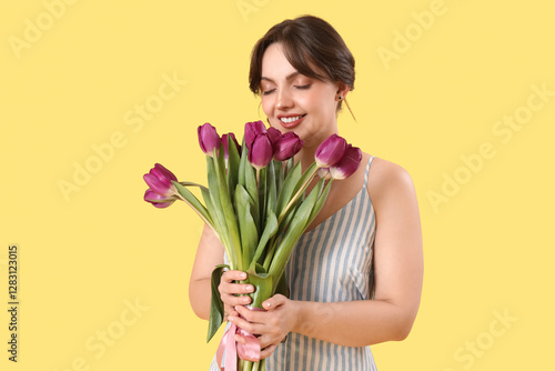Happy young woman with bouquet of beautiful purple tulips on yellow background