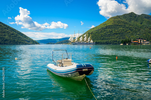 Harbour and boat at Boka Kotor bay (Boka Kotorska), Montenegro,