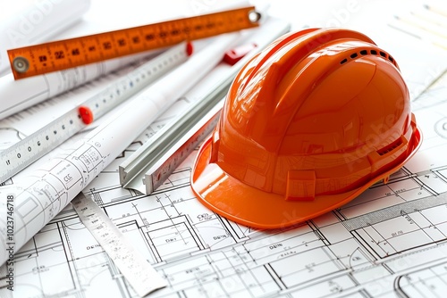 Hard hat, blueprints, and rulers isolated on a pristine white backdrop
