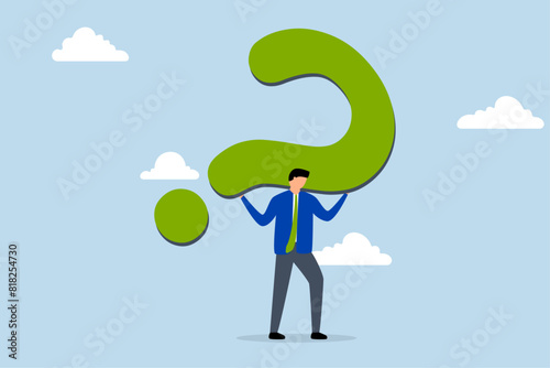 Hard question with no answer, frustrated trying businessman carrying heavy burden of big question mark.