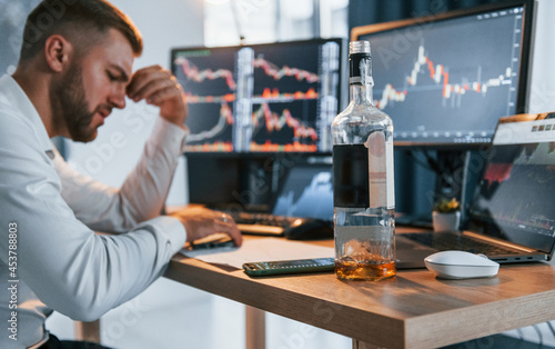 Hard working. Young businessman in formal clothes is in office with multiple screens