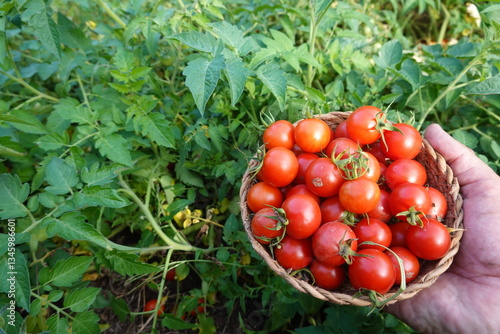 harvesting cherry tomatoes in the backyard garden with a wicker basket. harvesting summer fruit in the vegetable garden