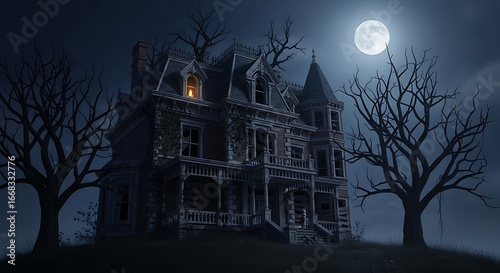 Haunted Victorian House on Hill Under Full Moon with Spooky Tree and Cloudy Night Sky