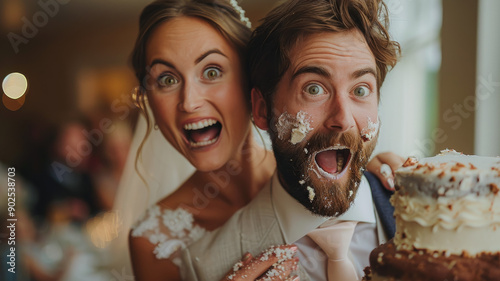 wedding, surprised, groom, cake, face, bride, laughing, joy, surprise, event, fun, party, celebration, prank, dessert, marriage, candid