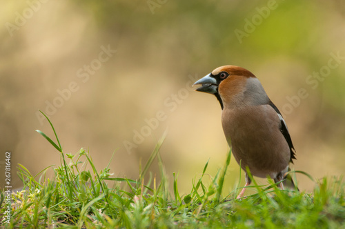 Hawfinch grosbeak - Coccothraustes coccothraustes in the grass eating