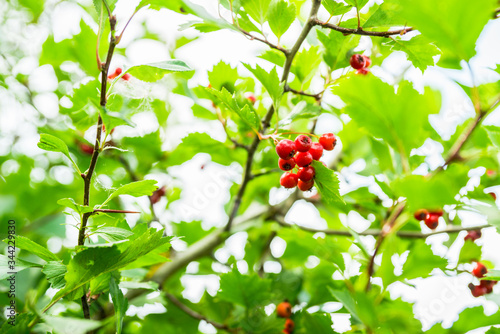Hawthorn bush with berries in the garden. Shallow depth of field.