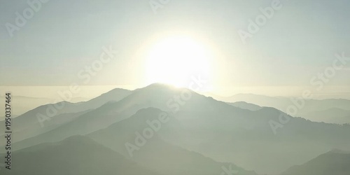 Hazy mountains stretch toward bright sun. Layers create depth, soft light dominates landscape. Peaceful, serene view.
