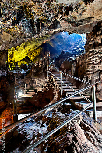 he staircase leading to Diktaio Andro ("Diktaen cave" or "Psychro Cave"), the "birthplace of Zeus", Psychro village, Lasithi plateau, Crete island, Greece.