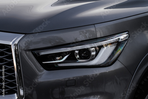 Headlight lamp of new cars. Close up detail on one of the LED headlights modern car. Exterior closeup detail. Closeup headlights of car.