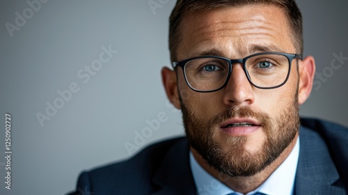 businessman, professional, confident, serious, thoughtful, studio, lighting, grey, head shot, portrait, goggles, beard, suit, attaching, business, adult, male, corporate, executive, leader, manager, office, formal, success, achievement, career, leadership, authority, strategy, planning, grey background, adult male