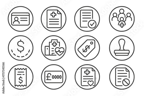 health, insurance, icon, line, style, round, card, policy, file, claim, form, provider, network, deductible, icon, covered, service, premium, tags, approval, stamp, receipt, number, page, status
