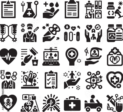 icon, icon, vector, set, symbol, business, signs, web, illustration, black, computer, car, cyberspace, money, media, diagnosis, doctor, hygiene, disease, injury, location, mask, medicals, patient, cost, health care, treatment, prevention, report, collection, white background, hospital
