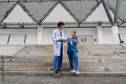 Healthcare professionals collaborate on patient care plans medical facility photography urban setting eye-level view teamwork concept