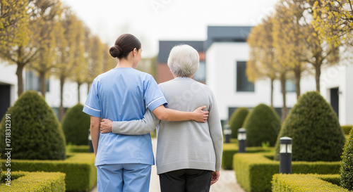 Healthcare worker with elderly woman on sunny path, senior support concept for eldercare advertising, hospital and clinic websites, senior living facilities, family care services, healthcare brochures
