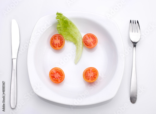 balance, idea, concept, diet, dietary, dietetic, food, dieting, background, calorie, care, closeup, fork, plate, knife, salad, tomatoes, cut, conceptual, eating, fat, eat, fitness, flatware, health, healthy, lifestyle, light, lightness, loose, lose, losing, loss, nourishment, nourishment, overeating, overweight, slender, slim, tape, tableware, weight, white, green, red, seed, serving