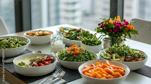 food, meal, healthy, salad, vegetable, dinner, lunch, cookery, eatery, dish, epicure, delicious, eating, fresh, tasty, vegetarian, vegan, diet, nourishment, organic, table, white, bowl, city, view, window, modern, bright, colourful, appetising, spring, summer, home, family, gathering, party, catering, buffet, clean, simple, minimalist, decor, lifestyle, epicure