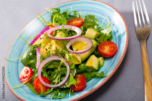 Healthy arugula salad with avocado, cherry tomatoes and onion served on colored ceramic plate