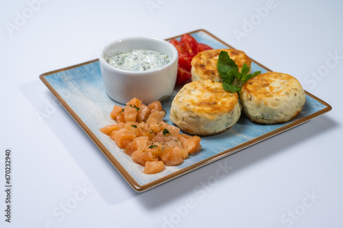 Healthy breakfast. Juicy cheese pancakes with sour cream and red fish on a square plate isolated on a white background. A sprig of mint, Homemade cheesecakes, salted