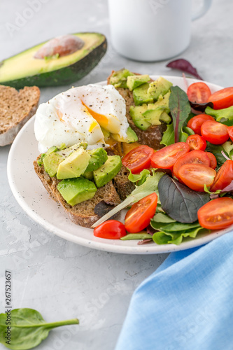 Healthy Breakfast with avocado toasts, poached egg and salad