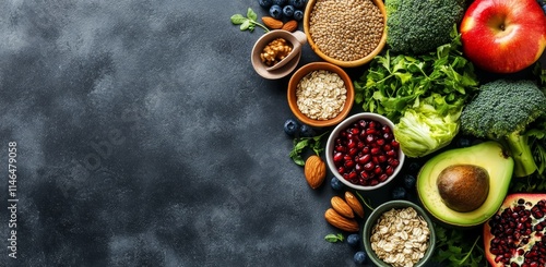 food, healthy, background, fruit, vegetable, nut, grain, dark, surface, apple, avocado, broccoli, blueberry, pomegranate, almond, oat, flax, seed, nourishment, diet, eating, lifestyle, wellness, organic, ingredient, fresh, natural, vitamin, protein, fiber, energy, bowl, table, top, view, composition, design, texture, copy, space