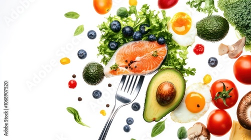 food, ingredient, healthy, diet, nourishment, salmon, avocado, egg, tomatoes, broccoli, blueberry, vegetable, fruit, fresh, plan, eat, tasty, delicious, white, background, eating, vegetarian, vegan, receipe, cooking, breakfast, lunch, dinner, produce, organic, natural, green, red, yellow, freshness, photo, still, life