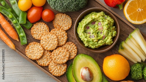 Healthy foods whole grains detox concept. A vibrant array of fresh vegetables, fruit, and crunchy crackers served with guacamole, promoting healthy eating and snacking.