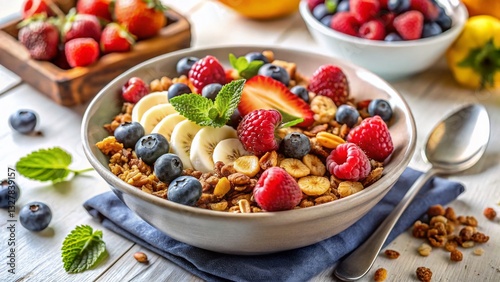 Healthy Gluten-Free Granola Bowl with Fresh Fruit & Nuts - Top View Stock Photo