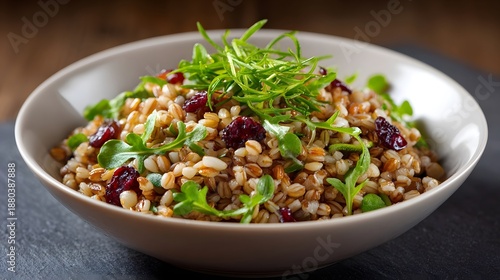 grain, salad, cranberry, greener, healthy, barley, wheat, seed, berry, herb, arugula, garnish, organic, fresh, natural, cooked, mixed, seasoned, epicure, rustic, wholesome, vegetarian, meal, food, cookery, cooking, dining, nourishment, diet, health, colourful, brown, red, green, texture, kernel, closeup, detail, surface, table, dark, background, soft, light, sharpened, depth, appetising, delicious, savoury