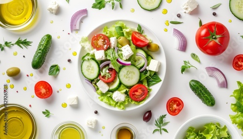 Healthy Greek salad with fresh vegetables and feta cheese dressed with olive oil photographed from above