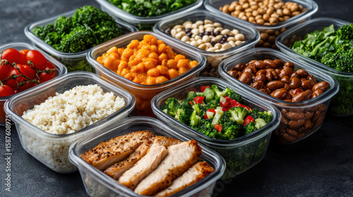 Healthy meal prep containers filled with nutritious foods like chicken, grains, and vegetables