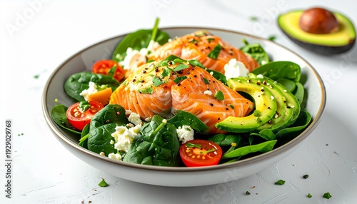salmon, avocado, salad, bowl, healthy, fresh, food, tomatoes, greener, diet, balanced, meal, plate, nourishment, fish, vegetable, spinach, feta, cheese, lunch, dinner, protein, omega, vitamin, light, bright, clean, eating, wellness, lifestyle, epicure, cooking, culinary, herb, garnish, tasty, delicious, starter, vibrant, colourful, modern, simple, table, white