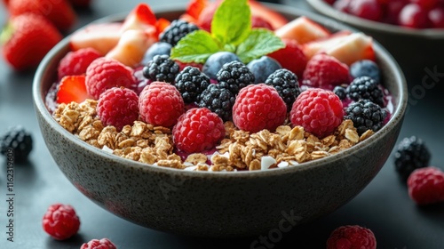 Healthy Smoothie Bowl Topped with Granola, Coconut, and Fruits