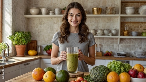 Healthy Start: Smiling woman in the kitchen, presenting a vibrant smoothie in a photorealistic setting, complemented by a fresh array of colorful fruits and vegetables.