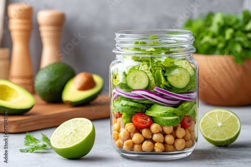 Healthy vegan salad in a jar with chickpeas, cucumbers and avocado