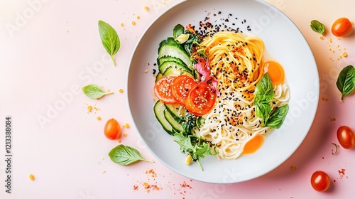 salad, healthy, food, dish, plate, vegetable, tomatoes, cucumber, basil, egg, breakfast, lunch, dinner, organic, fresh, diet, nourishment, wellness, lifestyle, energy, natural, green, colourful, closeup, topview, overhead, studio shot, still life, tasty, appetising, delicious, alimentary, balanced, vibrant, wholesome, nourishing, vegetarian, vegan, epicure, culinary, cookery, meal, refreshing, summer, receipe, ingredient