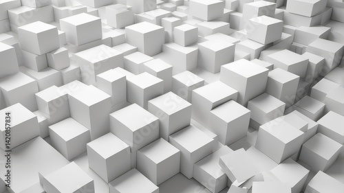 Heap of different scaled white boxes geometrical background wallpaper banner pattern flat lay from above, fading out with copy space