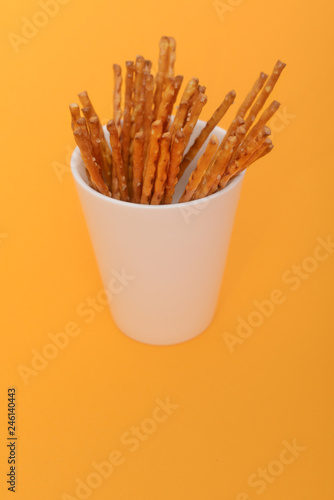 heap of salted sticks in white cup