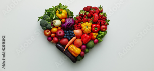 Heart shape made from various fresh fruits and vegetables, heart shaped arrangement of fruits and vegetables on a surface